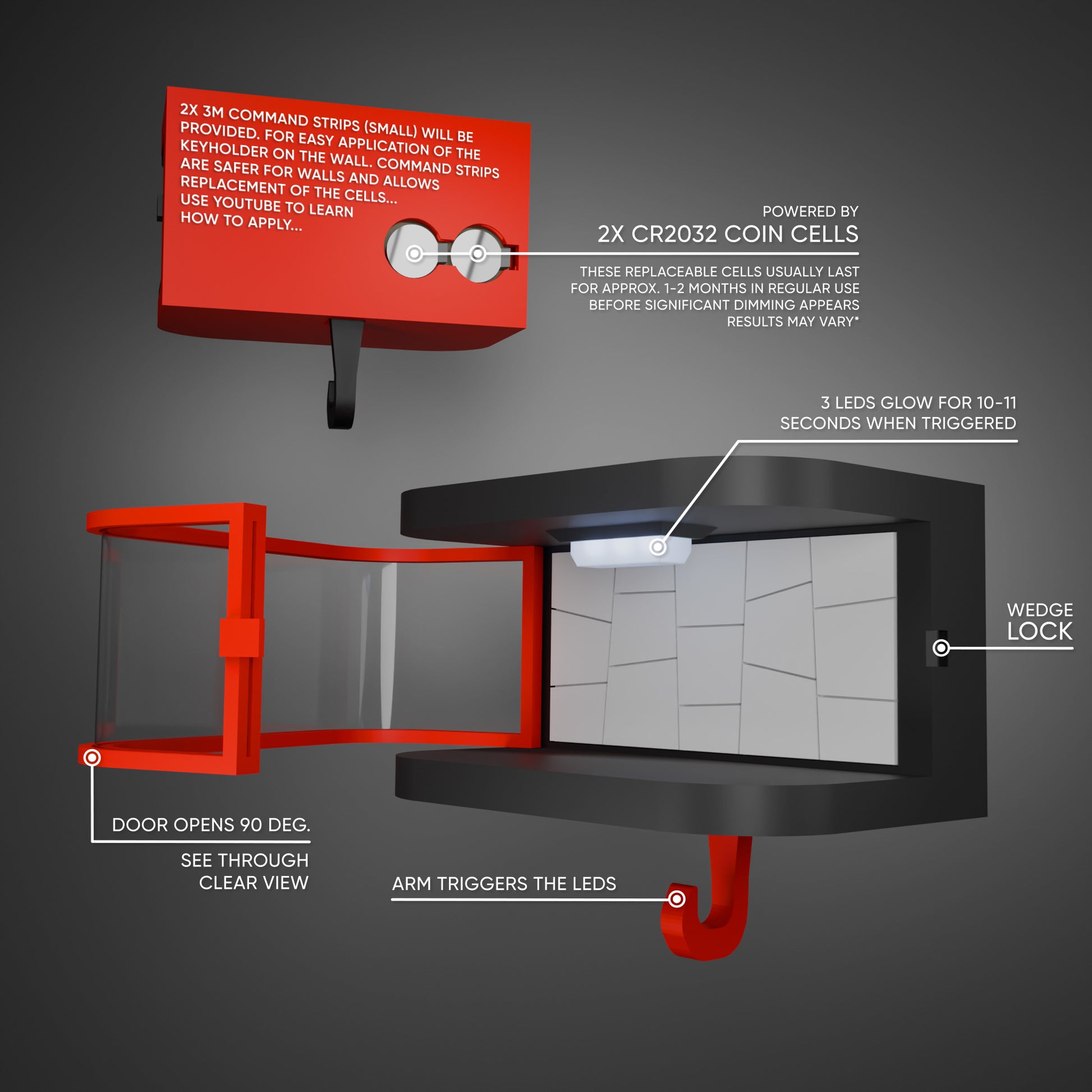 - Automatic LED lighting — activates for ~10 seconds when keys are placed